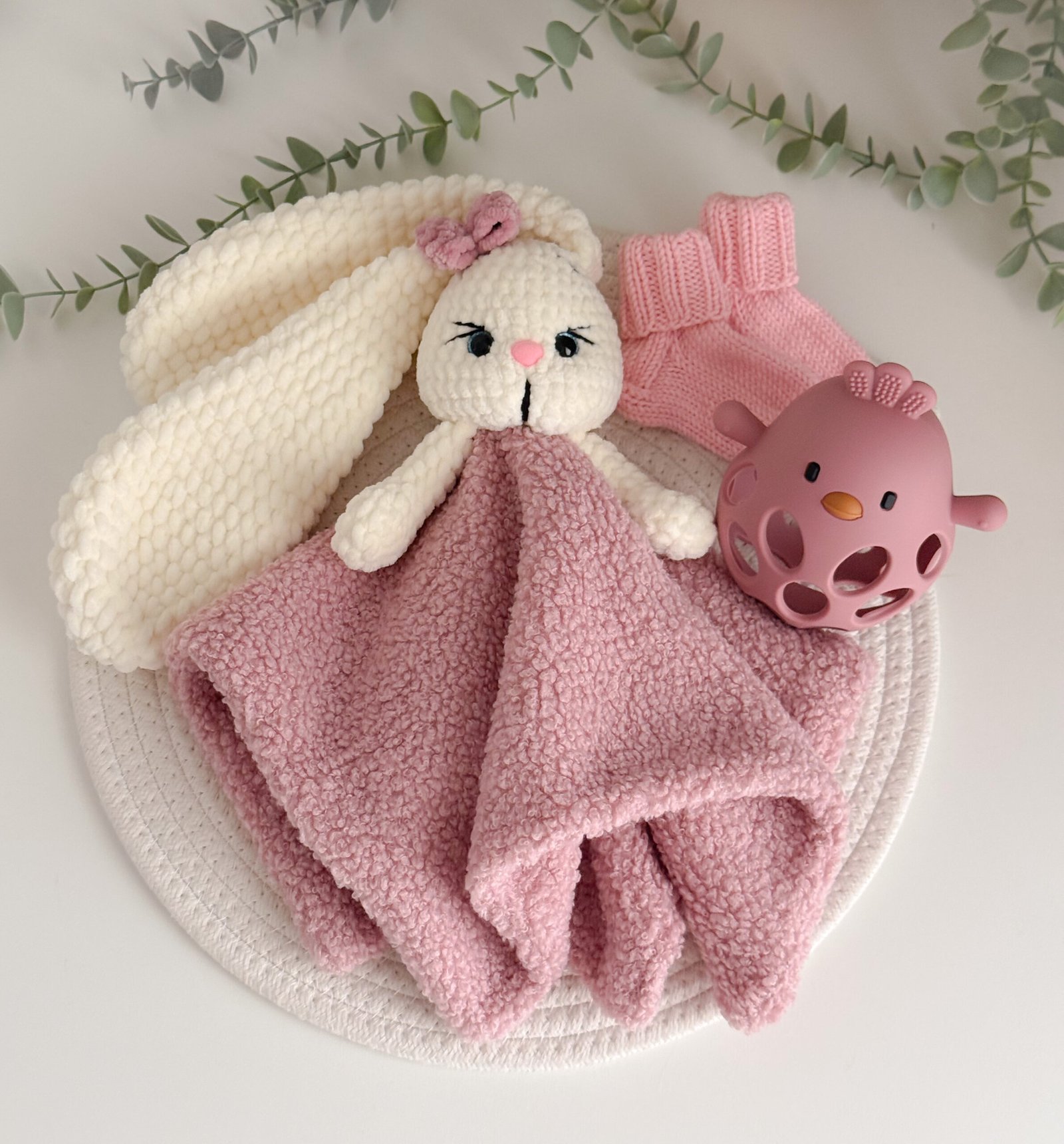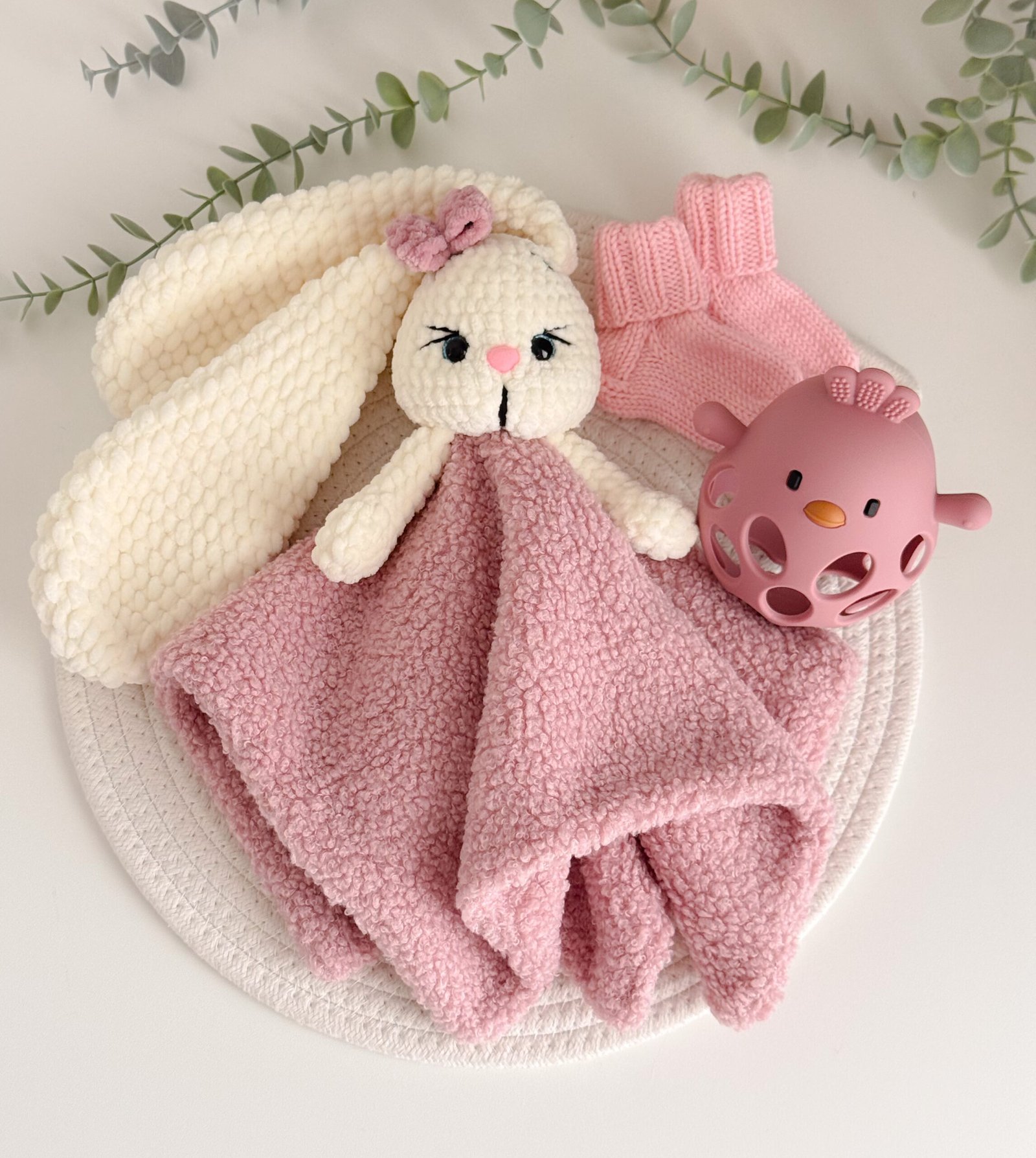 4 dalių Dovanų rinkinys Medvilnės vafliuko rankšluostis, merino vilnos kojinytės, migdukas, silikoninis kramtukas