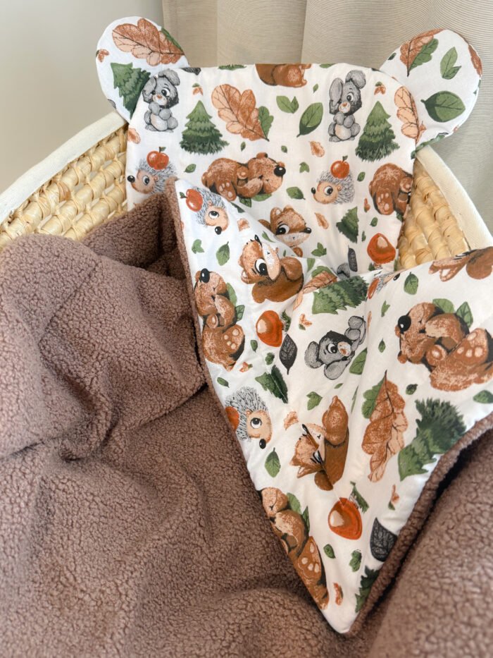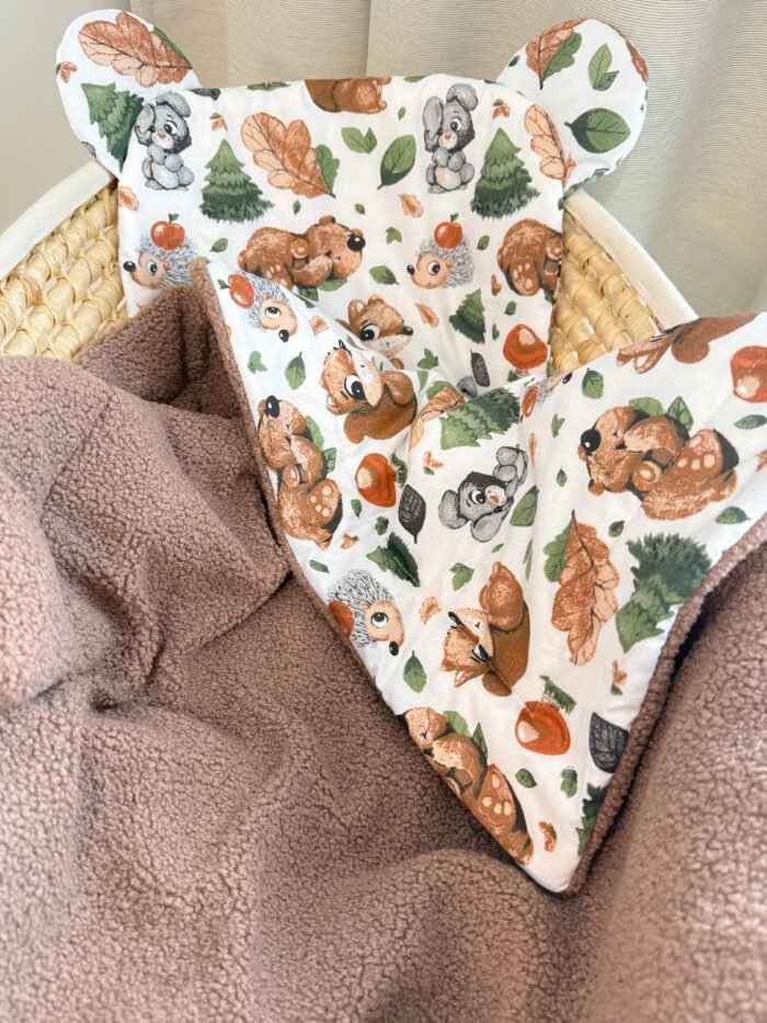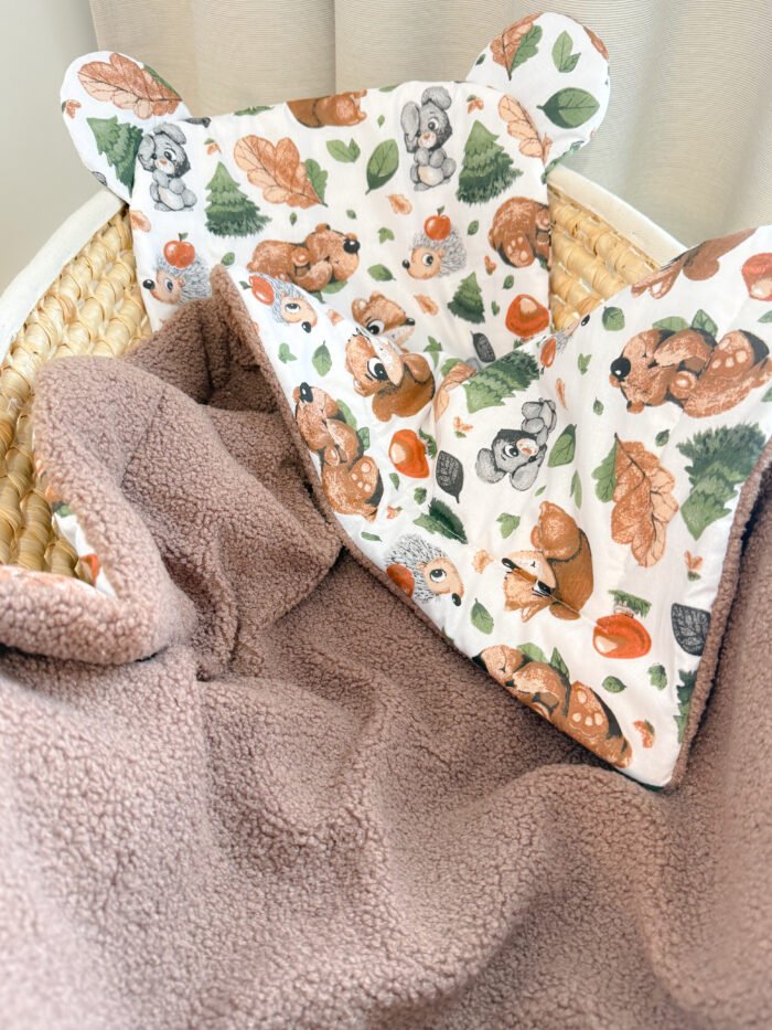 Dvipusis pledukas – pasiūtas iš sertifikuoto Teddy audinio, kitoje – lengva, kvėpuojanti medvilnė/drobelė.