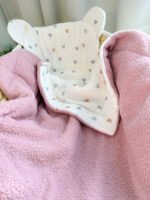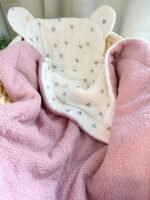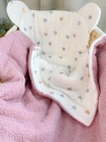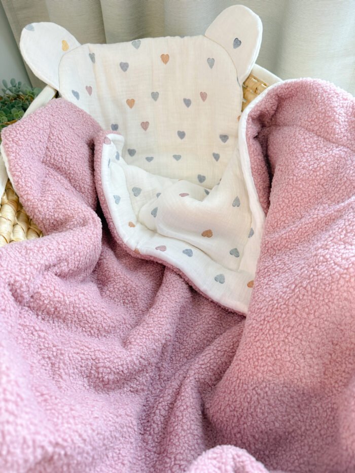 Dvipusis pledukas – pasiūtas iš sertifikuoto muslino ir Teddy audinio. Kad pledukas būtų dar šiltesnis ir jaukesnis, viduje galime įsiūti putlų neaustinį medvilninį audinį (85% medvilnė, 15% poliesteris).