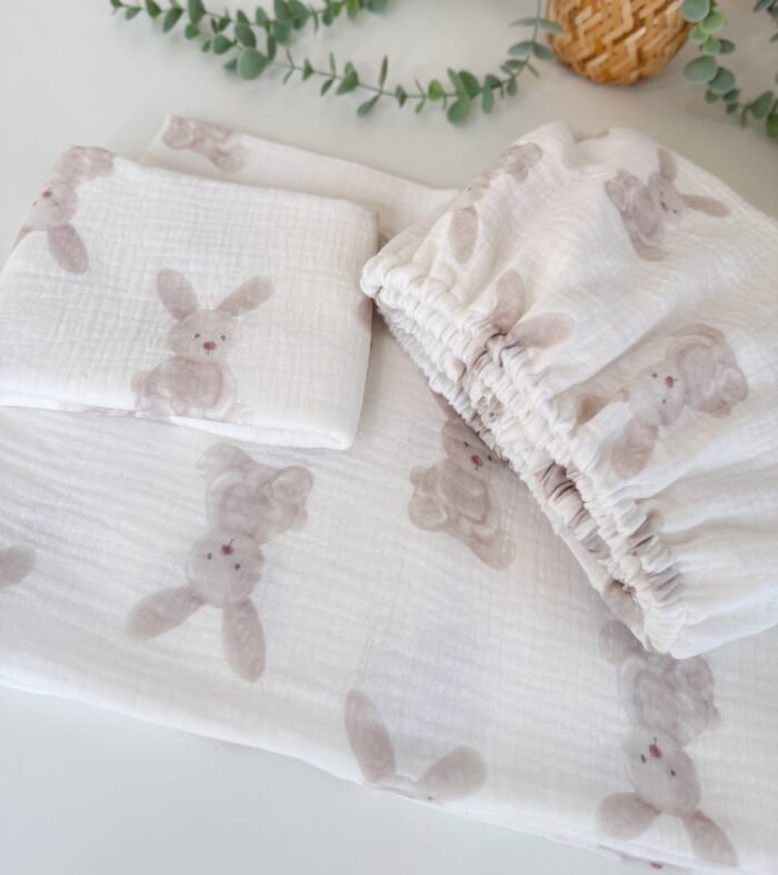 Muslino 3 dalių patalynės komplektas „Kiškutės”