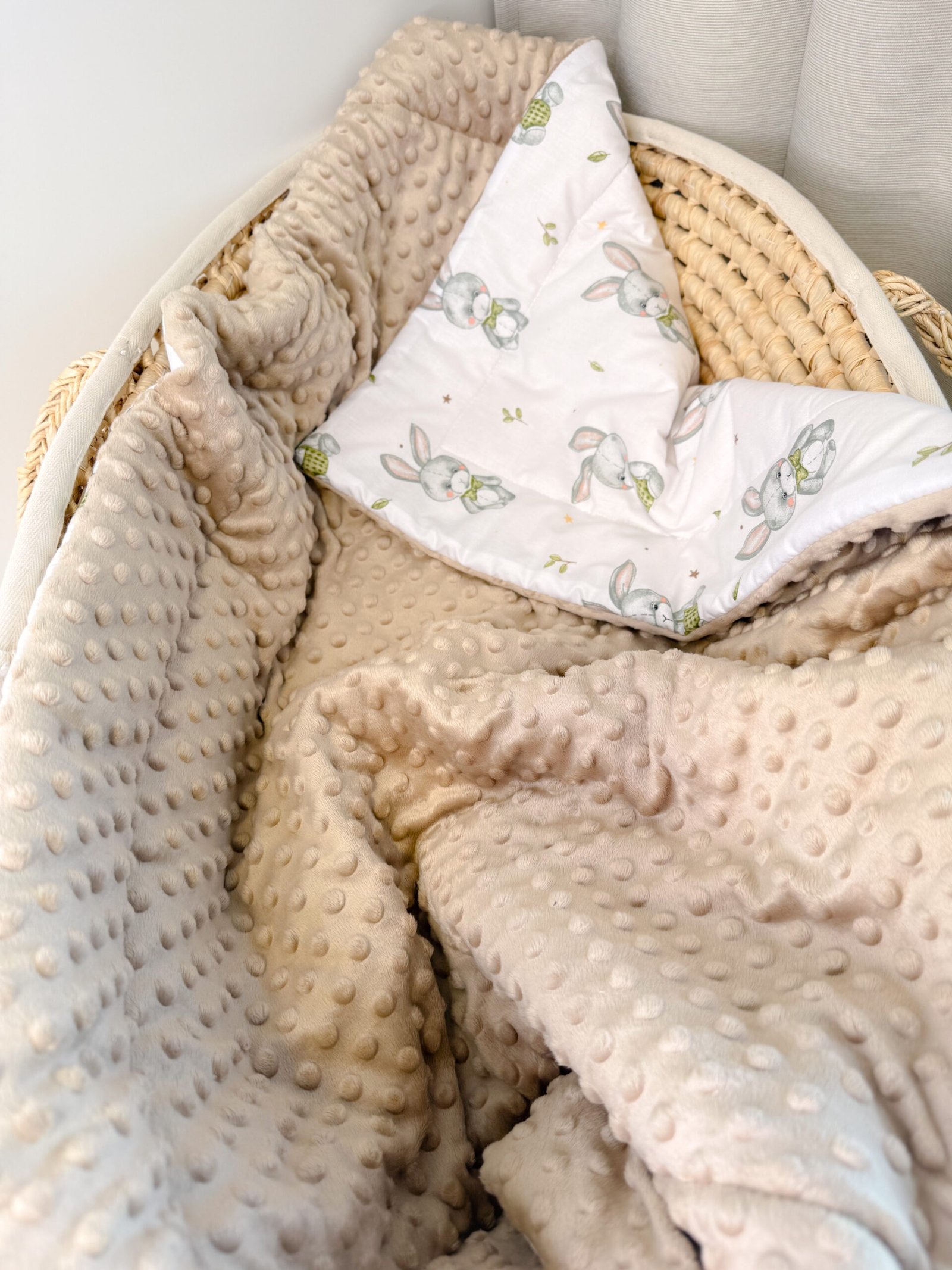 Pledukas yra dvipusis, pasiūtas iš sertifikuotos medvilnės ir minky audinio, o kad pledukas būtų dar jaukesnis ir šiltesnis – viduje galime įsiūti putlų neaustinį medvilninį audinį 85% medvilnė, 15% poliesteris.