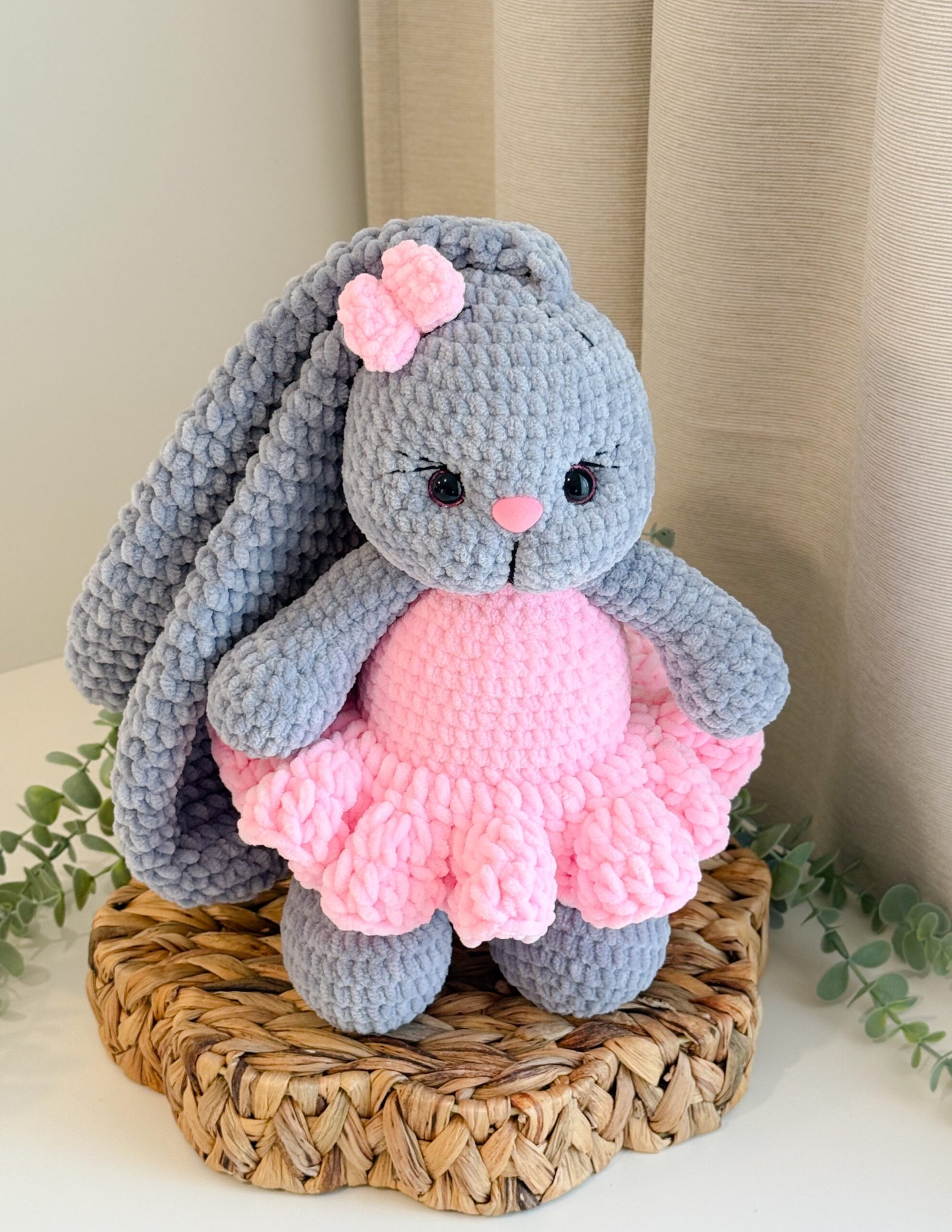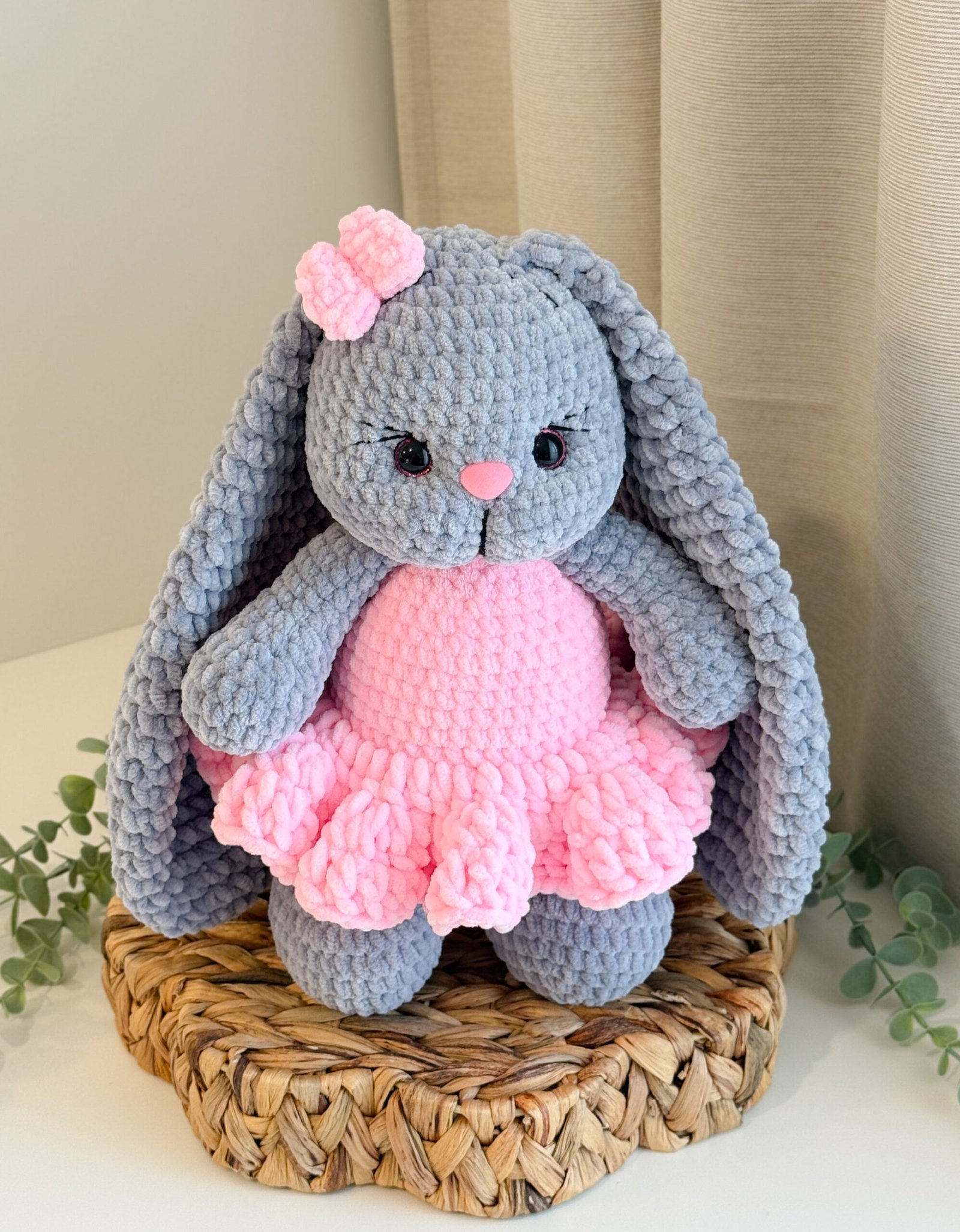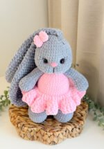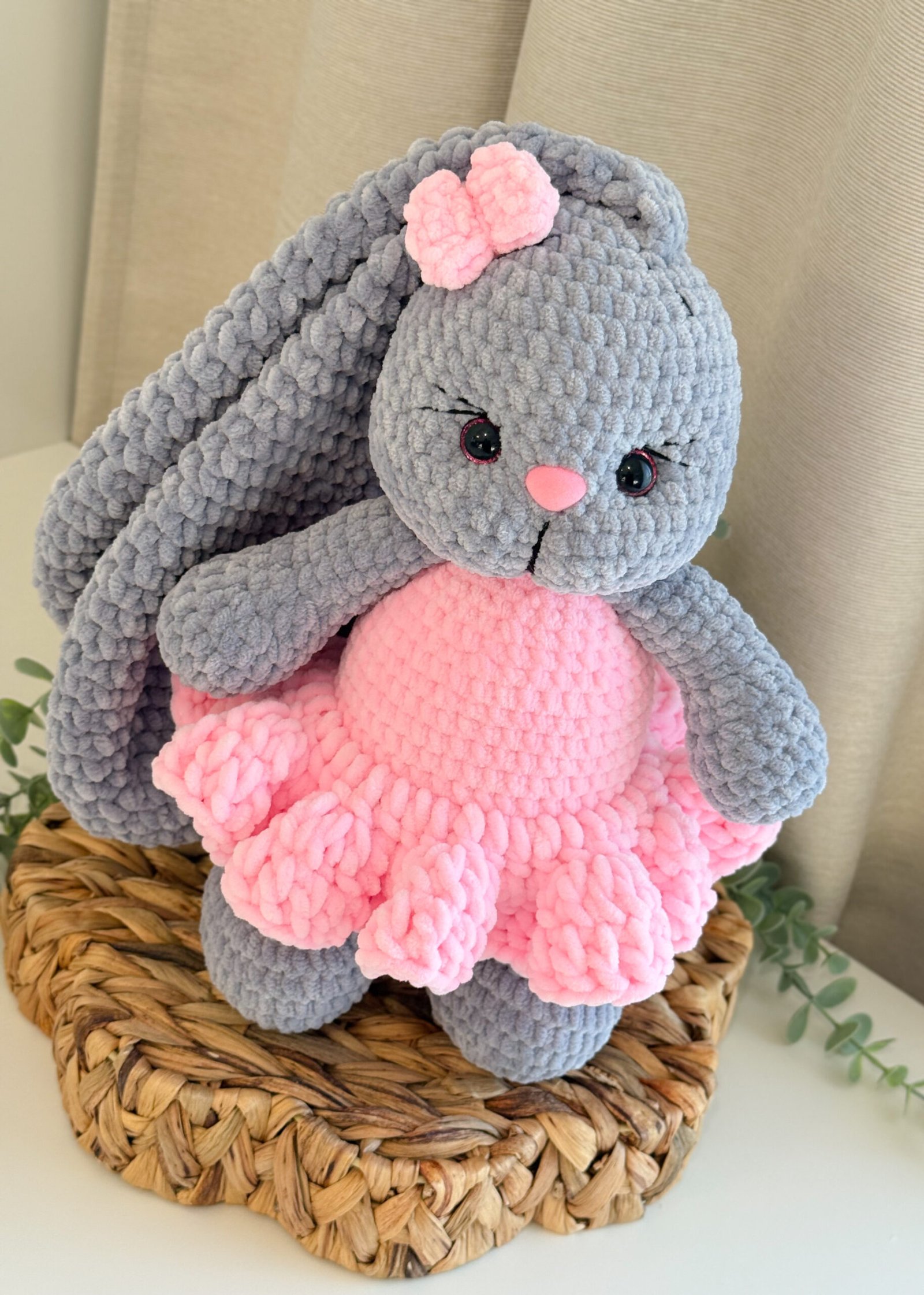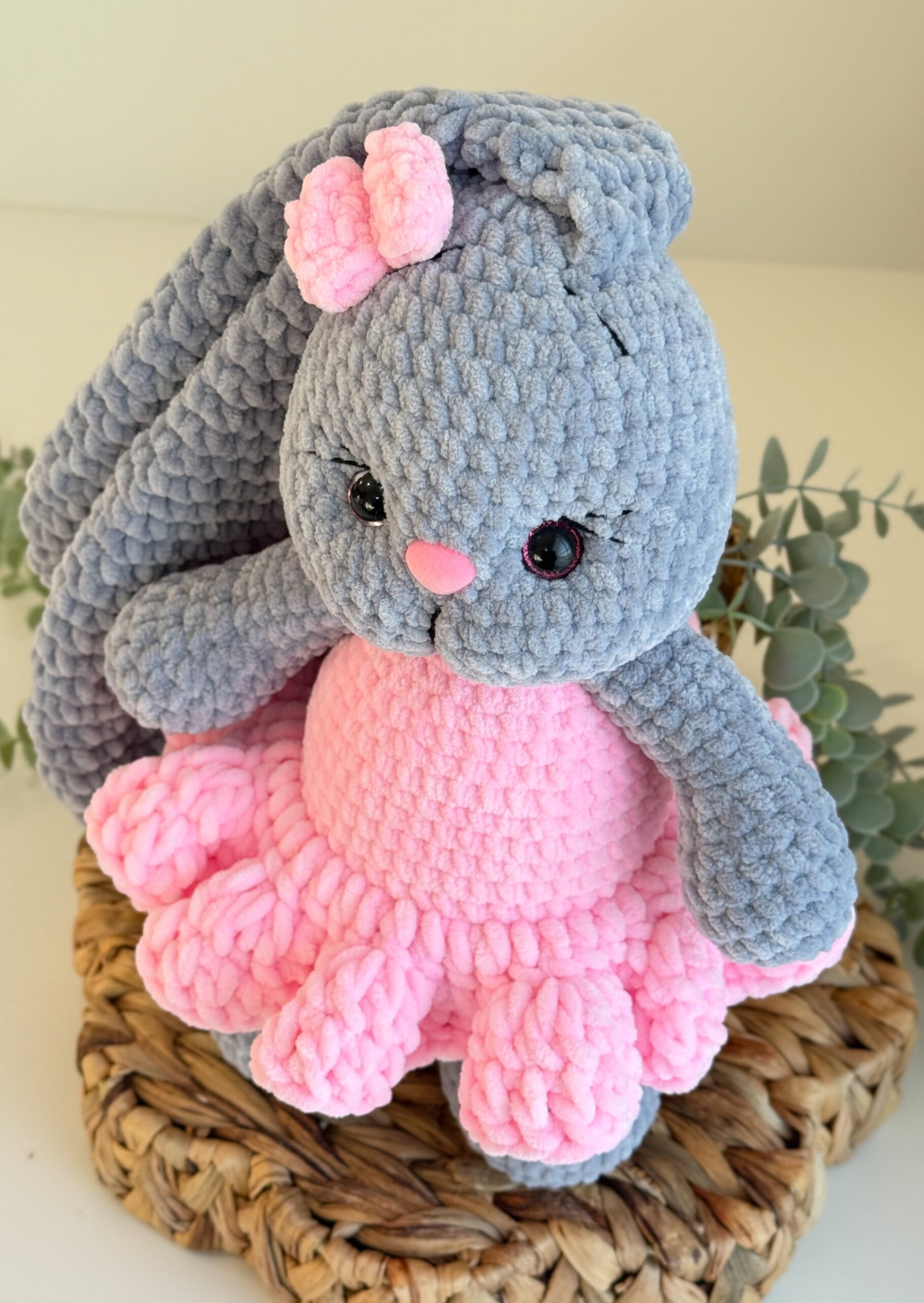 Pagamintas iš Himalaya Dolphin Baby siūlų – 100% super minkšto poliesterio pliušo, hipoalerginio ir saugaus vaikams. Šie siūlai pasižymi švelniu veliūriniu prisilietimu, idealiai tinka kūdikių drabužiams, antklodėms ir amigurumi žaislams. Kiekvienas rankų darbo nertas zuikis yra unikalus ir pagamintas su dideliu rūpesčiu.