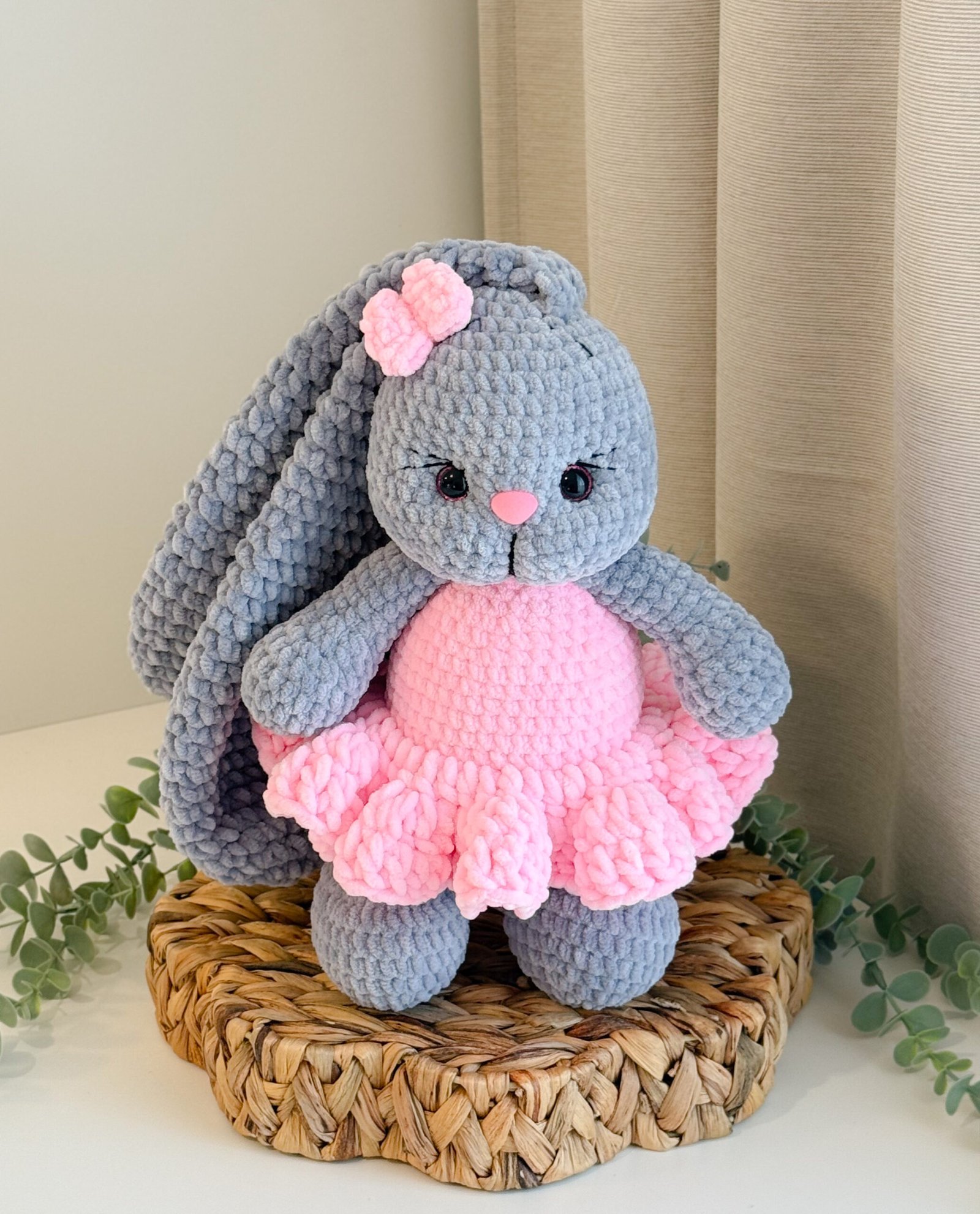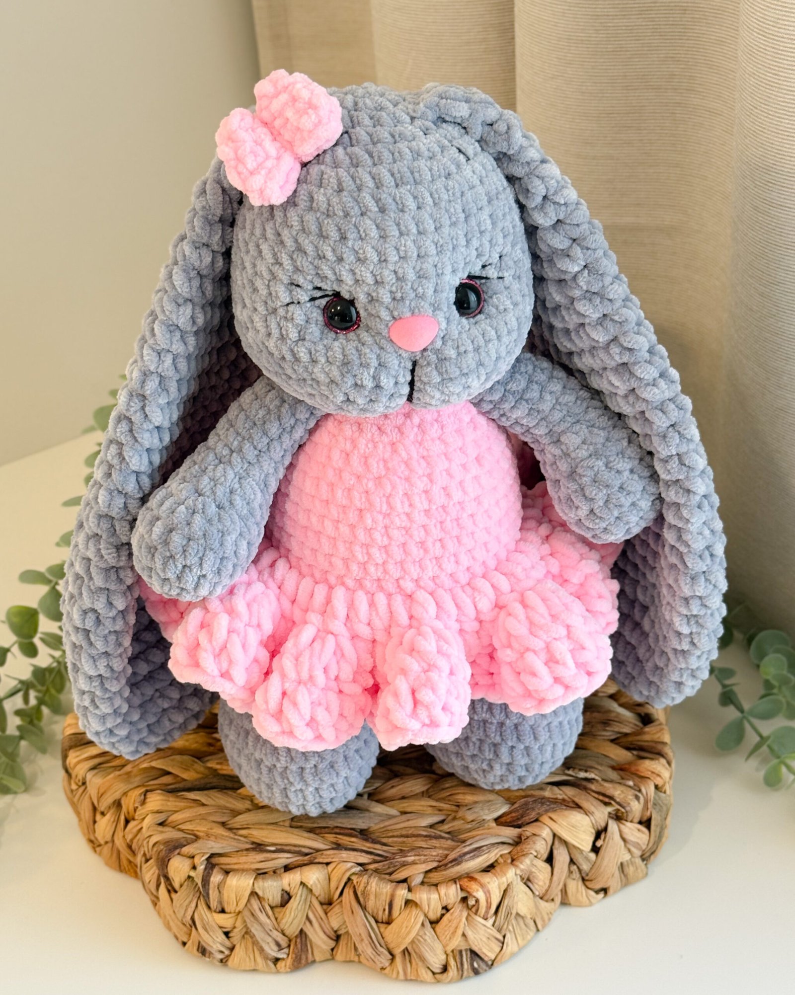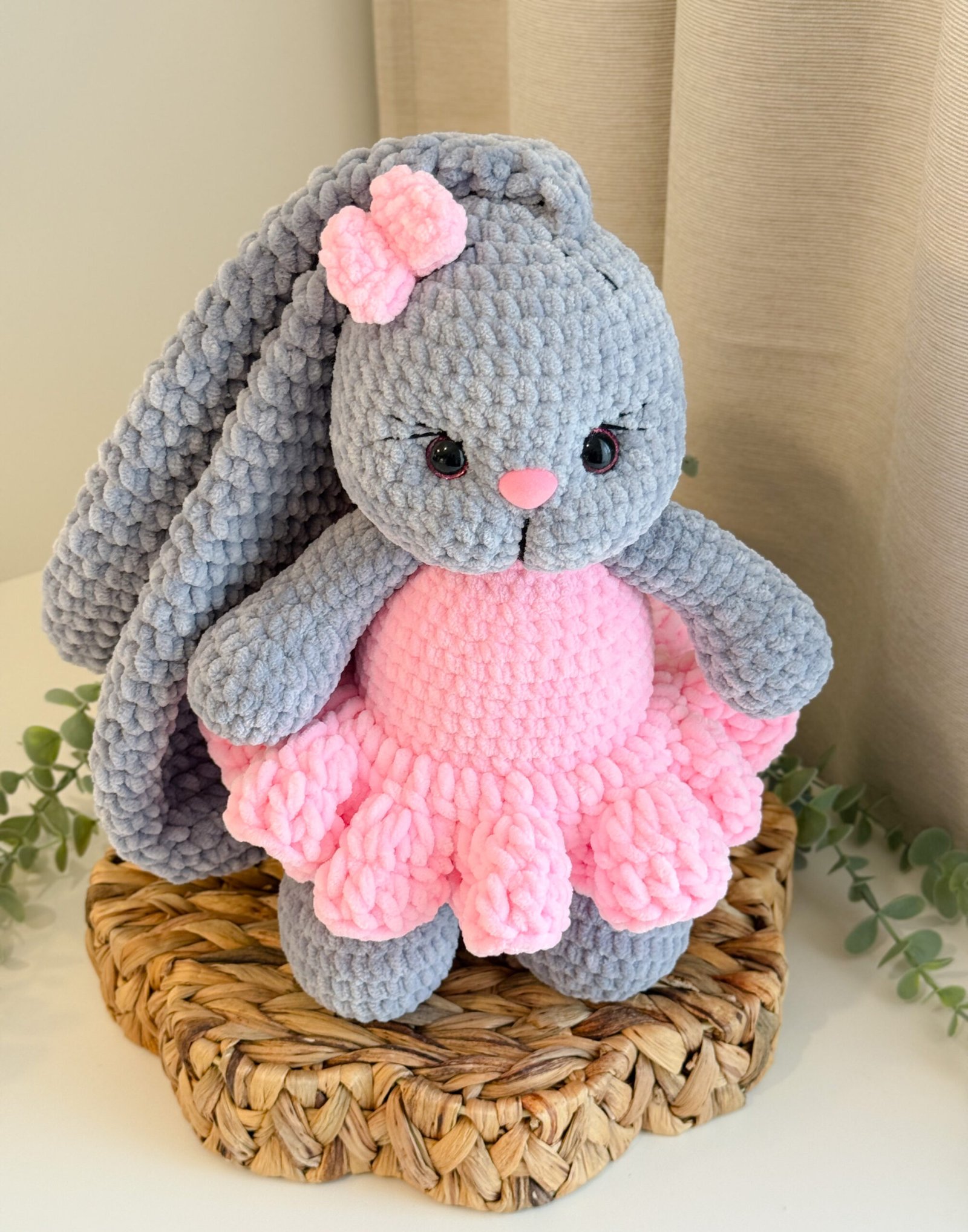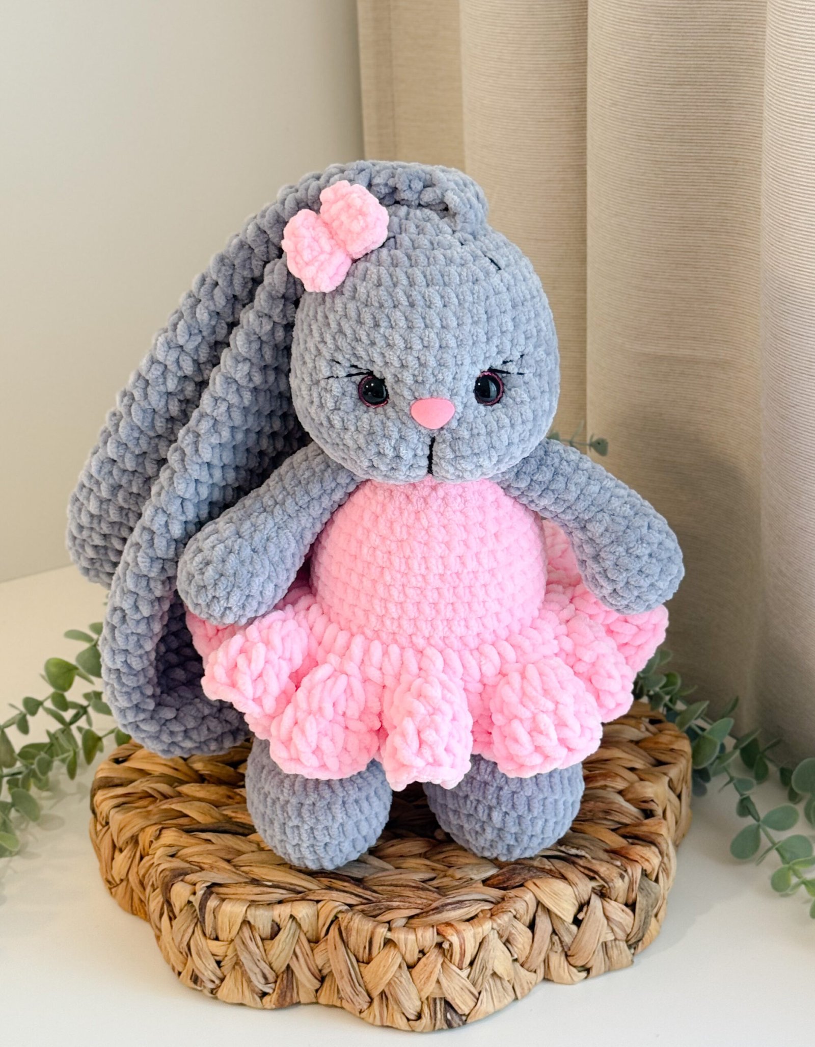 Pagamintas iš Himalaya Dolphin Baby siūlų – 100% super minkšto poliesterio pliušo, hipoalerginio ir saugaus vaikams. Šie siūlai pasižymi švelniu veliūriniu prisilietimu, idealiai tinka kūdikių drabužiams, antklodėms ir amigurumi žaislams. Kiekvienas rankų darbo nertas zuikis yra unikalus ir pagamintas su dideliu rūpesčiu.